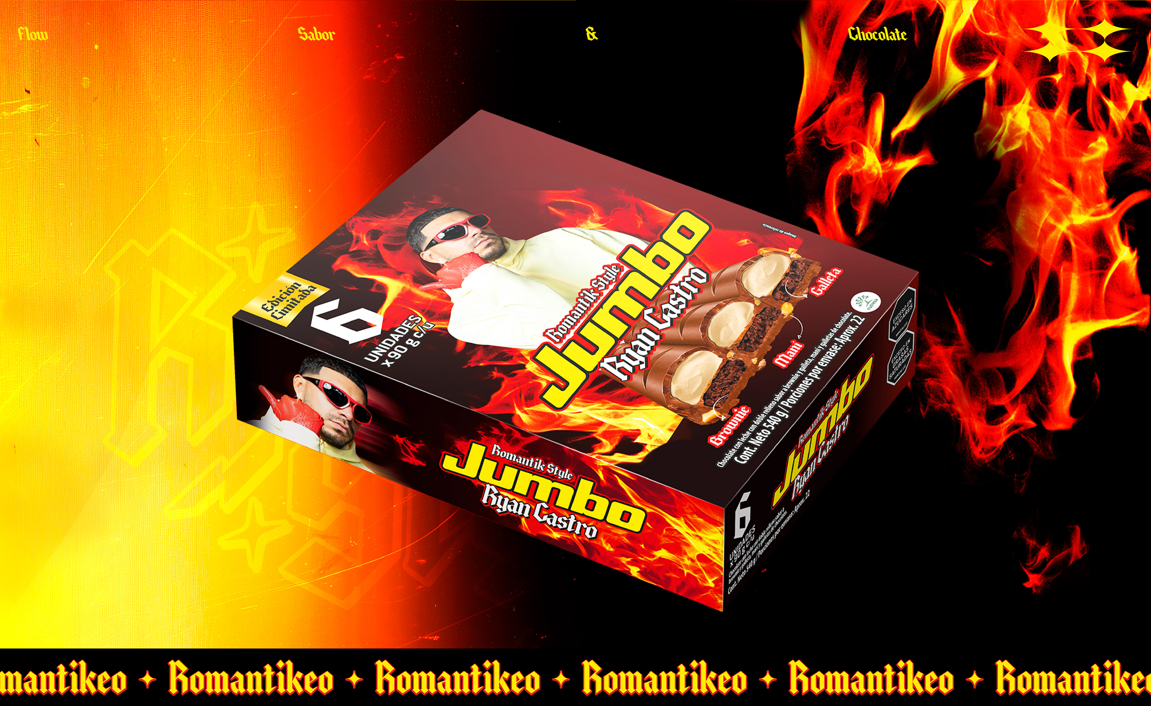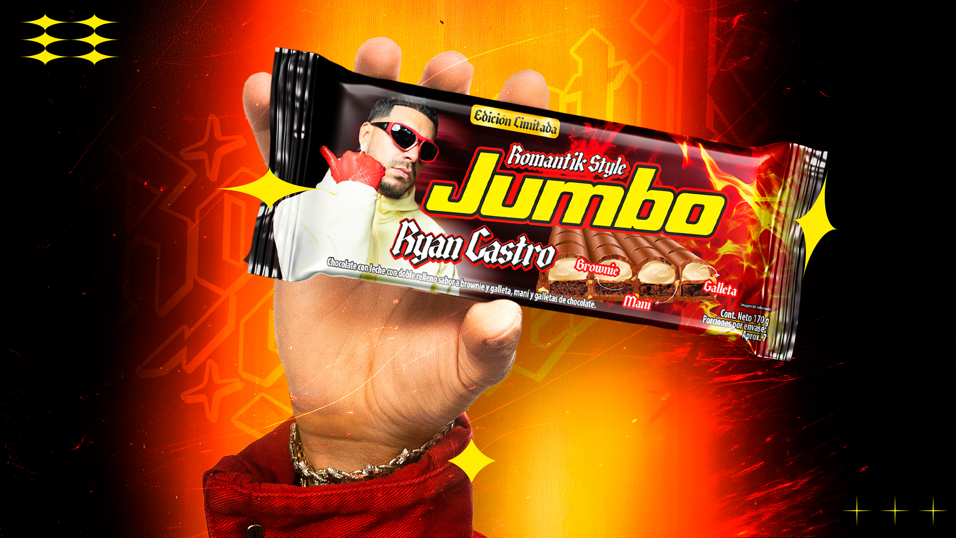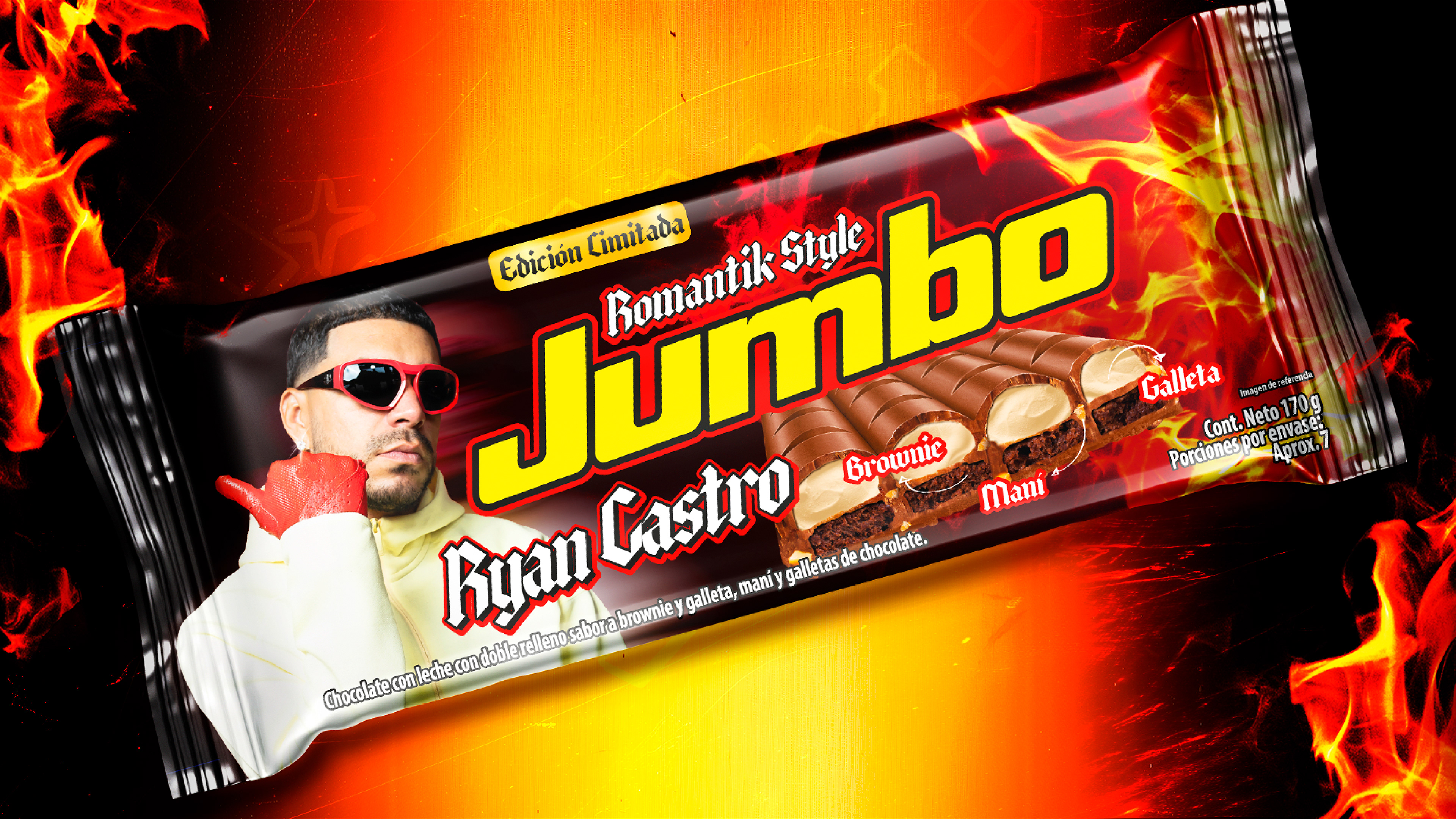 (ESP) ¿Qué pasa cuando el poder de Jumbo se une al flow de Ryan Castro? Creamos una edición limitada que convierte el empaque en un escenario urbano, lleno de energía, estilo y actitud. Colores intensos, vibras de Medellín y un beat de reggaetón que no solo se escucha: se muerde, se saborea y se disfruta en grande. Esta es la chocolatina que lleva el Romantik Style directo a tus manos. (ENG) What happens when the power of Jumbo meets the flow of Ryan Castro? We created a limited edition that turns the wrapper into an urban stage, packed with energy, style, and attitude. Bold colors, Medellín vibes, and a reggaeton beat you don’t just hear—you bite, taste, and enjoy to the fullest. This is the chocolate bar that brings Romantik Style straight to your hands.