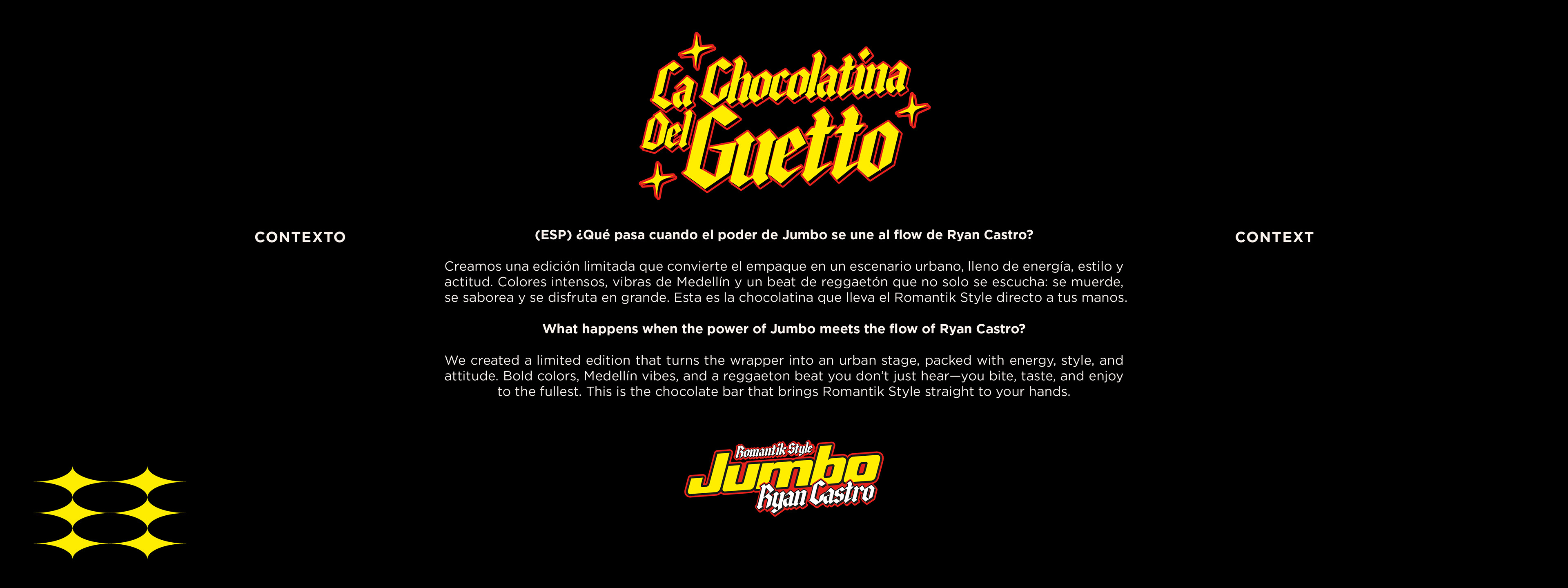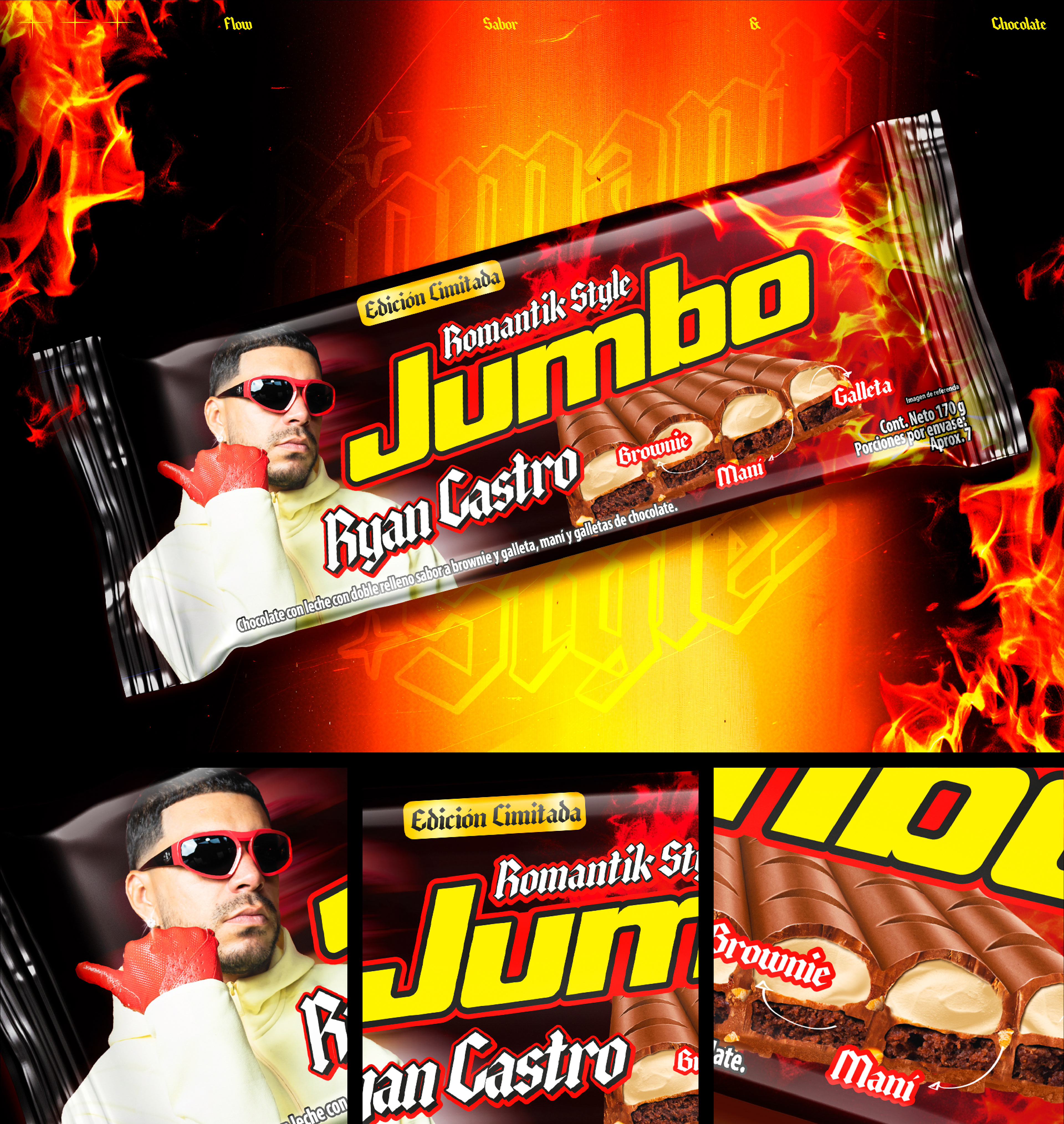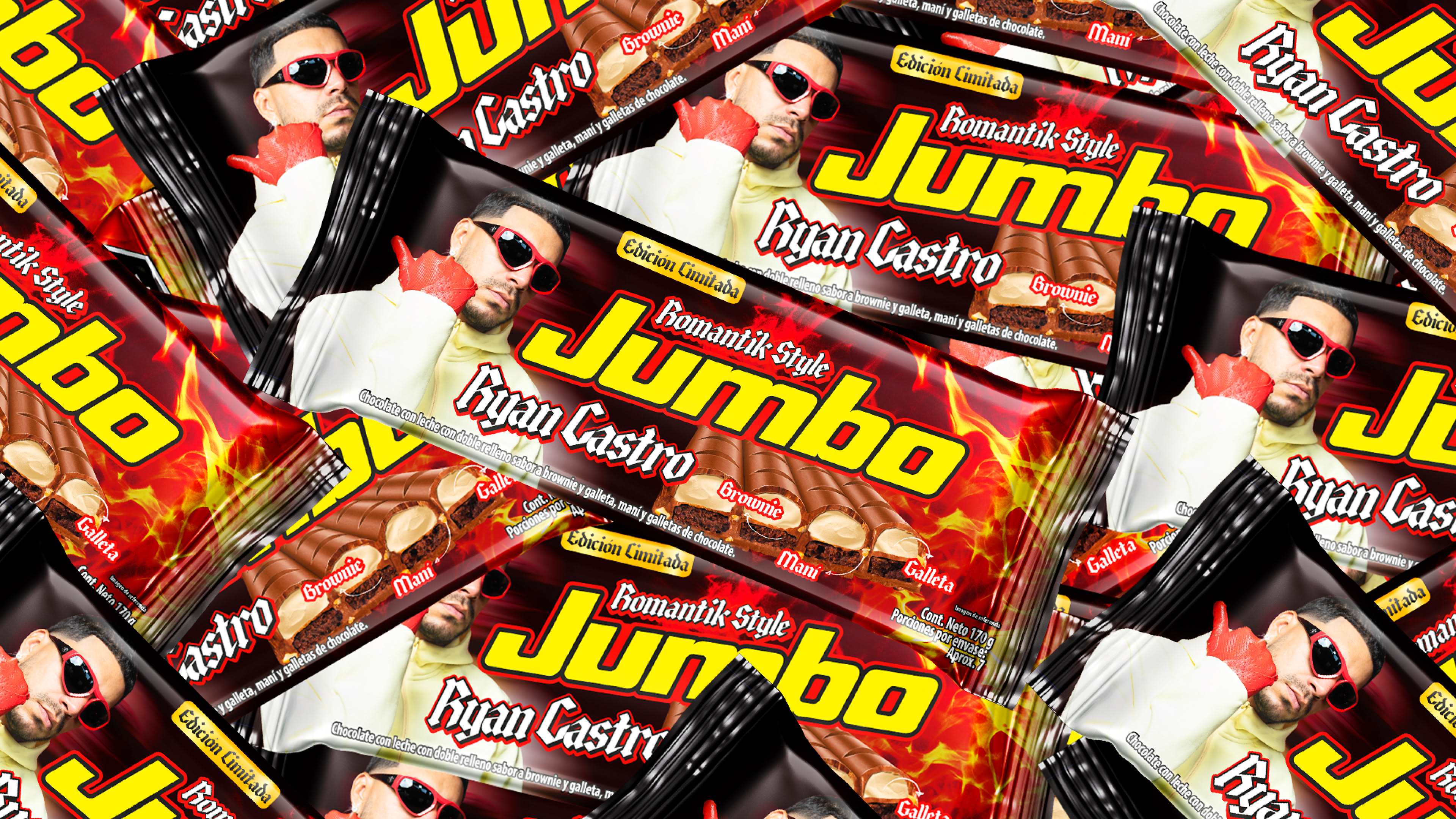 (ESP) ¿Qué pasa cuando el poder de Jumbo se une al flow de Ryan Castro? Creamos una edición limitada que convierte el empaque en un escenario urbano, lleno de energía, estilo y actitud. Colores intensos, vibras de Medellín y un beat de reggaetón que no solo se escucha: se muerde, se saborea y se disfruta en grande. Esta es la chocolatina que lleva el Romantik Style directo a tus manos. (ENG) What happens when the power of Jumbo meets the flow of Ryan Castro? We created a limited edition that turns the wrapper into an urban stage, packed with energy, style, and attitude. Bold colors, Medellín vibes, and a reggaeton beat you don’t just hear—you bite, taste, and enjoy to the fullest. This is the chocolate bar that brings Romantik Style straight to your hands.